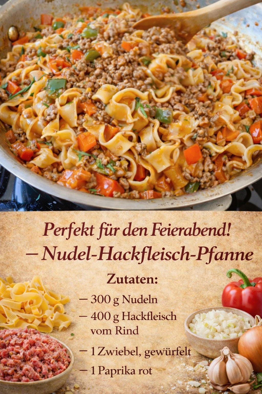 Diese Nudel-Hackfleisch-Pfanne ist ein echter Alltagsretter: schnell gemacht, herrlich herzhaft und bei der ganzen Familie beliebt. Saftiges Hackfleisch, knackige Paprika und eine aromatische Tomatensauce machen dieses Gericht zum perfekten Feierabendessen.