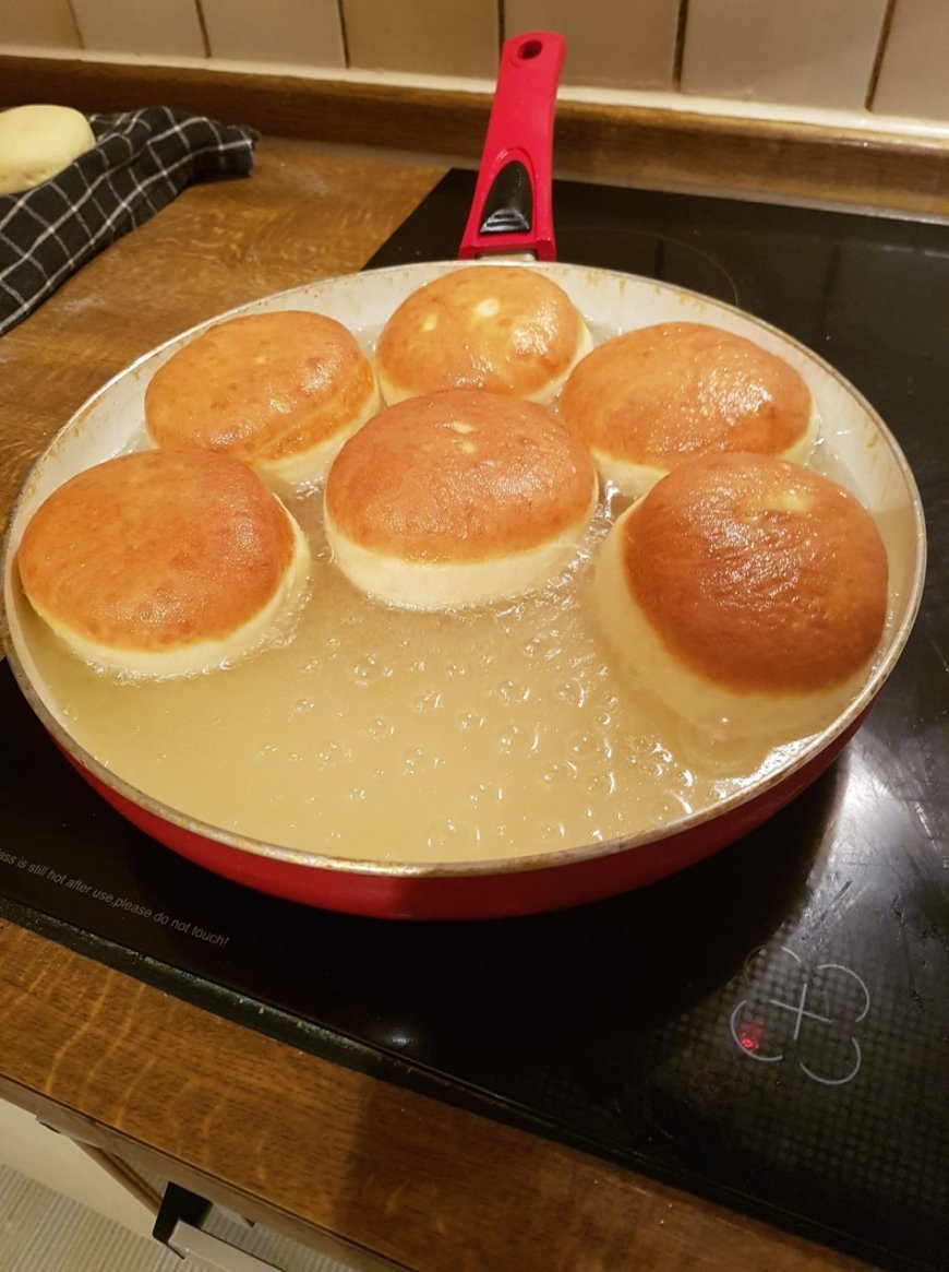 4. Jetzt die Krapfen mit der Oberseite nach unten vorsichtig ins Fett gleiten lassen und zudecken. Etwa gute 1 1/2 Min. backen, nachsehen, wenns goldbraun ist, umdrehen und weitere 1 1/2 Min. weiterbacken, dann nochmals umdrehen und 20 bis 30 Sekunden nochmals die Oberseite backen, sehr wichtig!!