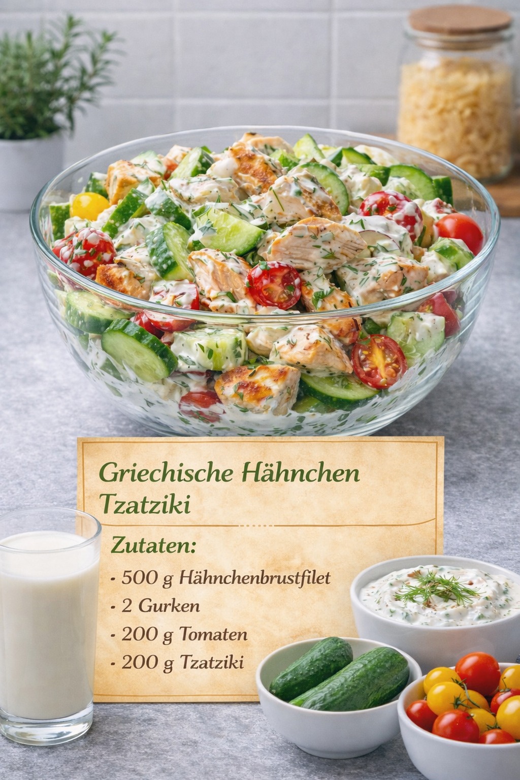 Gurken, Tomaten und Hähnchen in eine große Schüssel geben.