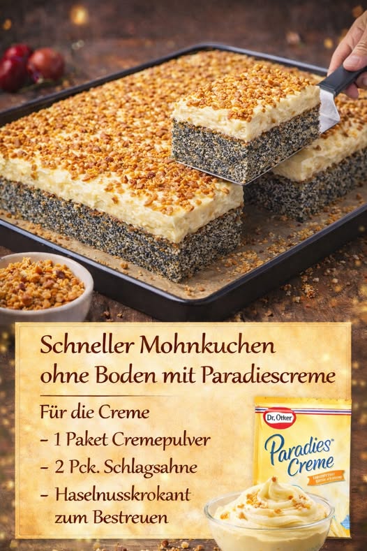 Schneller Mohnkuchen ohne Boden mit Paradiescreme