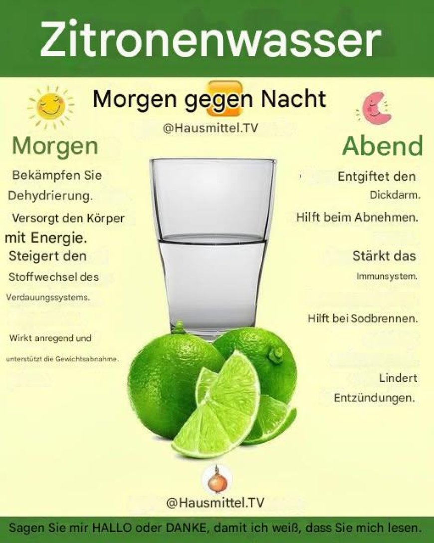 Sich anzugewöhnen, morgens und abends Zitronenwasser zu trinken, ist eine einfache, kostengünstige und wirksame Methode, etwas für den Körper zu tun. Es verbessert die Verdauung, stärkt das Immunsystem, fördert die Flüssigkeitszufuhr und hilft, den Körper auf natürliche Weise zu reinigen. Eine kleine tägliche Maßnahme, die langfristig große Ergebnisse bringt.